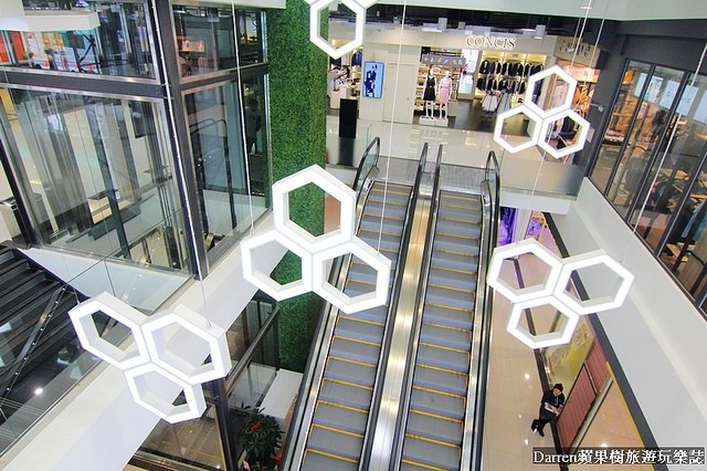 JC PARK食尚廣場的商城空間寬敞明亮,像蜂巢般logo以及綠色植物牆面讓空間看起來年輕有活力的氛圍