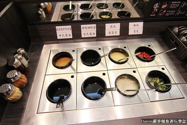 沾醬調味粉比較特別的有絕品鵝肝芝麻醬和特製柑橘醬,しゃぶしゃぶ温野菜的獨家醬料旁邊也有教學如何搭配其他沾醬調配