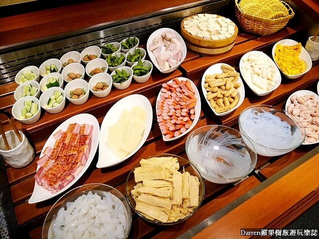 小菜鍋肴麵食有手工豆腐、豆皮、年糕、芋頭、厚切培根、甜不辣、蒸煮麵等,約有16種鍋肴可以挑選