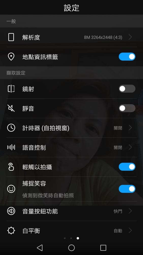 ▲ 800 萬畫素的前置鏡頭同樣有著微笑快門和觸碰螢幕快門的選擇。
