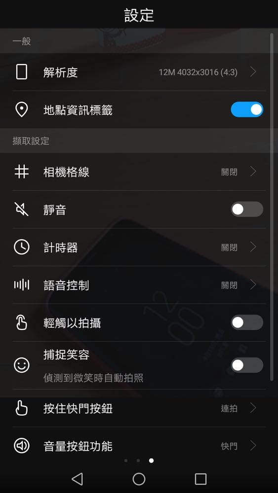 ▲ 主相機最高可以調到 1200 萬畫素的解析度,還能開啟「捕捉笑容」的微笑快門設定。