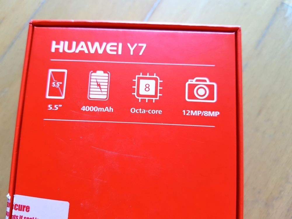 ▲ 紅色外盒底部直接把 Y7 主要的特色,5.5 吋螢幕、4000mAh 電池容量、8核心處理器與 1200 萬/ 800 萬畫素相機組合列出來。