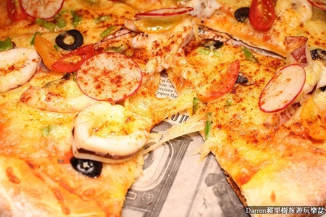 、櫻桃蘿蔔,撒上西班牙風乾甜椒粉,餅皮略帶點焦焦脆脆披薩口味微辣加上乳酪香氣微微牽絲滿滿餡料超有誠意