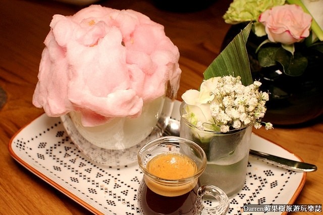 粉紅色的雲朵在杯口上,上面撒上少許的跳跳糖,底下是小農契作鮮奶可以淋上濃縮咖啡液,讓甜蜜棉花糖融入拿鐵很有特色