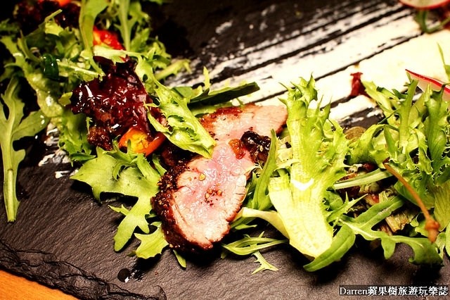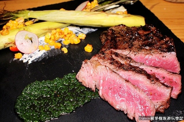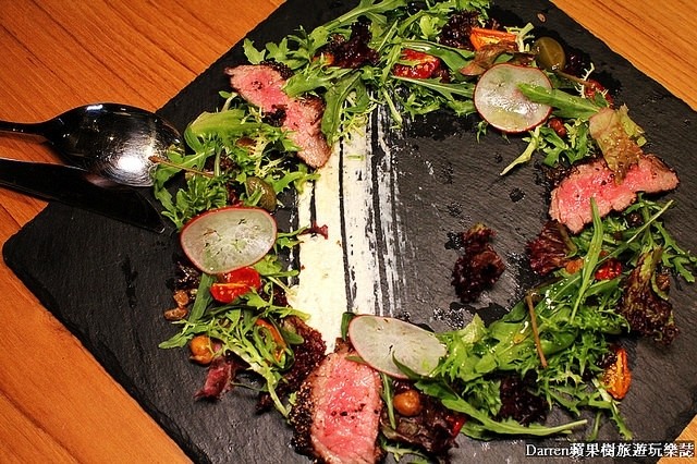 使用龍眼果木來碳烤,烤牛排還會放迷迭香來增加香氣沙拉有佐風乾番茄、櫻桃蘿蔔、炸鷹嘴豆、蔬菜、酸豆果