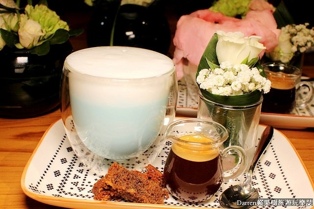 夢幻飲品再來一杯把自製的蝶豆花糖漿融入熱鮮奶,讓拿鐵看起來湛藍夢幻,加入濃縮咖啡液立馬變成好喝的視覺系拿鐵