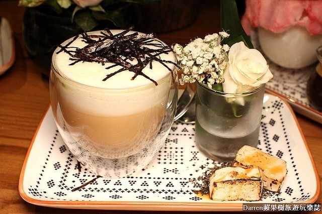 拿鐵咖啡和宇治抹茶粉搭配,在綿密奶泡撒上海苔絲,讓抹茶拿鐵喝起來有海苔味,一旁的焦糖碳烤麻糬佐黑芝麻與抹茶拿鐵很搭