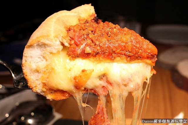 五公分的厚度超級厚切的披薩拍完照請店員幫忙切開後滿滿乳酪傾流出,往上一拉滿滿的牽絲邪惡誘人
