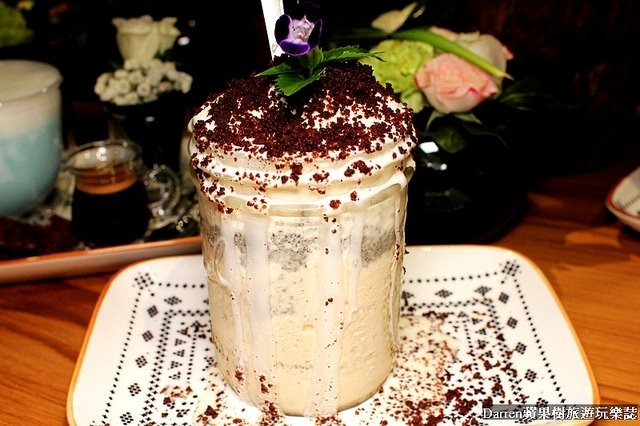 飲料就如品名一樣像盆栽長出一朵花花朵是可食用花整體造型非常可愛飲料以花生冰淇淋奶昔為底