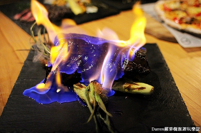 醃製兩天後爐烤搭配烤時蔬,上桌時會來個桌邊服務點火燒烤瞬間火燒豬肋排的畫面讓同行友人快門按個不停