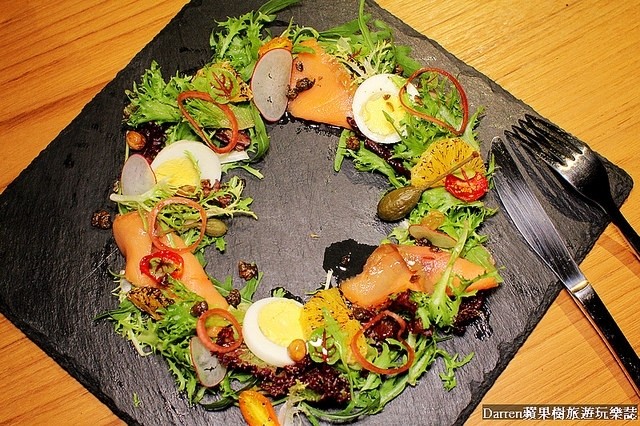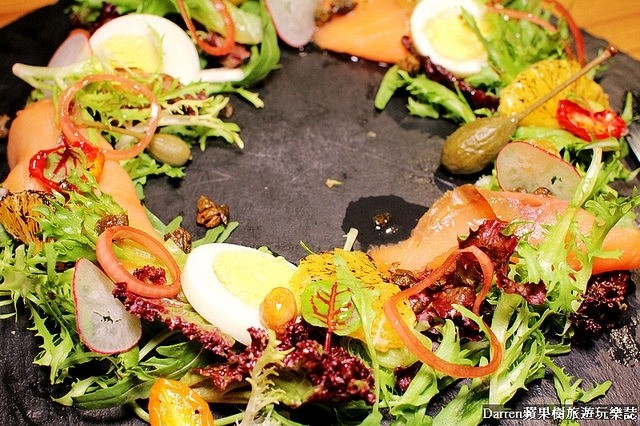 擺盤就像一個色彩繽紛的花圈,以煙燻鮭魚搭配綜合生菜、櫻桃蘿蔔、烤柳橙片、風乾番茄、酸豆果等
