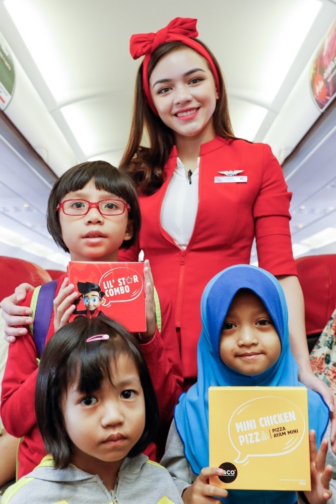 今天從AirAsia各航站出發的1,000多個航班,超過7,000名兒童都免費獲得了一份全新的兒童餐。小星星組合套餐(Lil’ Star) 是亞航為兒童特製的機上套餐,內容包含一個迷你披薩、一杯飲料與ㄧ份點心 。小星星組合套餐使用可愛的兒童點心盒裝,迷你披薩上鋪滿嚴選雞柳,再加上香濃番茄醬、莫札瑞拉和切達起司,讓小朋友越吃越順口。