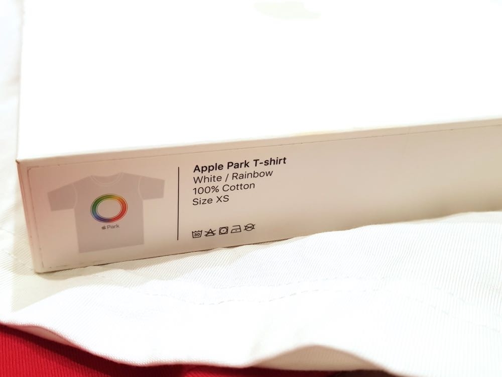 Apple Park 的紀念 T Shirt 在正中央以 Apple Park 的圓形設計為主,下方寫著 Park 字樣,包裝上這次也挑選跟之前的彩色蘋果 logo 設計款的彩虹 Park。