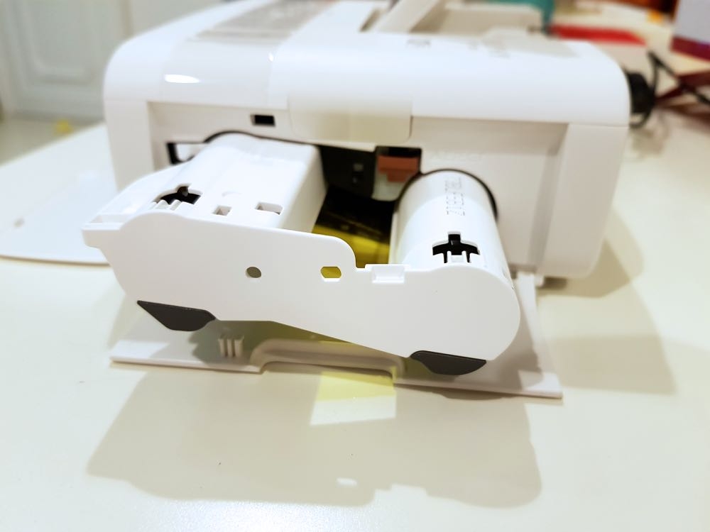 因為是熱昇華的技術,所以在列印的過程中我們可以看到相片紙張會分成四次進出才完成,先是黃色、再來加上紅色、再加上藍色,最後就是白色來完成。