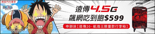 ◆遠傳網路門市獨享遠傳4.5G飆網吃到飽$599兩年約加碼送獨家航海王行李箱(非賣品)