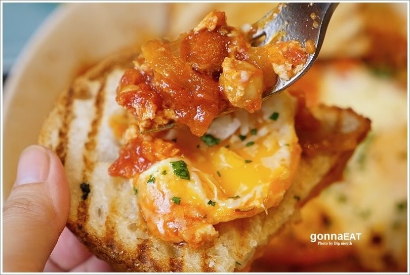 ▼巴斯克風味半熟蛋佐酸種麵包,採用西班牙香腸、鷹嘴豆、烤甜椒和大蒜融在番茄醬汁入味後,再加上兩顆半生熟的無毒機蛋,最後再灑上帕瑪森乳酪、烤酸麵包片,一上桌便聞到濃濃的香氣!