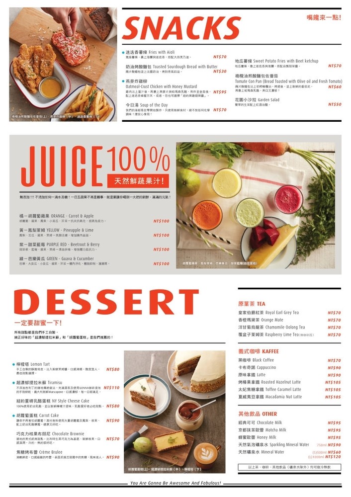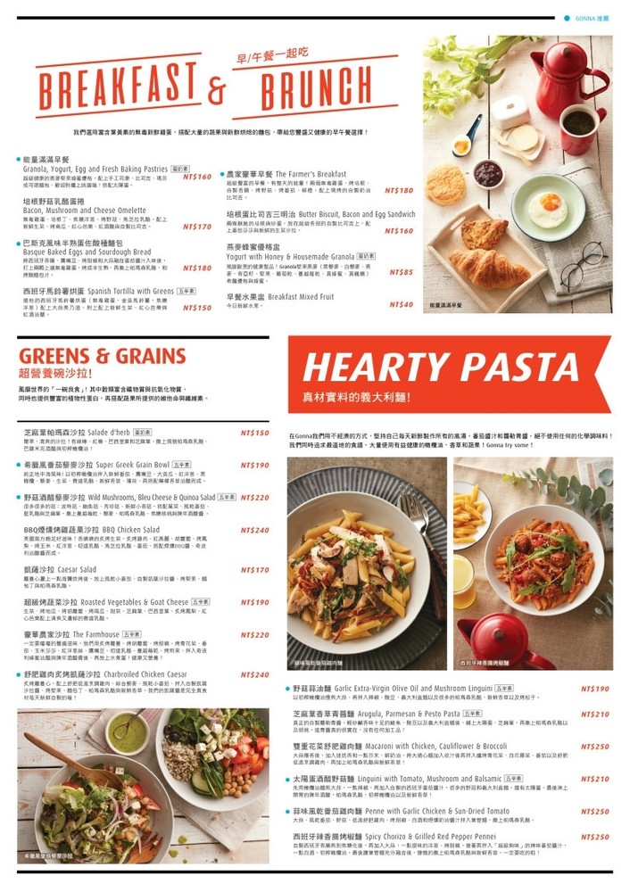 「gonnaEAT共樂遊」不僅環境明亮又時尚,搭配旅行及生活風格的實體空間,讓人心情不由得放鬆起來!餐點有早午餐、沙拉、義大利麵、肉品、漢堡、帕尼尼、點心、飲品、甜點等,選擇還不少,重點是口味都有一定的水準,不僅能讓人吃到好菜、好肉,還有天然的蔬果汁可以享用,真是太幸福了!店家從食材到醬料都非常講究,盡量不使用加工製品,就是希望大家能吃得健康又安心~也為生活開啟新的想像與美好!推薦給大家,有興趣的朋友不妨可以來品嚐看看,或許也會跟大口一樣一吃就愛上!