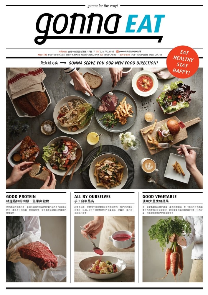 又讓大口發現一間好餐廳啦!位於台北內湖區石潭路上的「gonnaEAT共樂遊」餐廳,是雄獅集團旗下的新品牌,不僅結合旅行、生活與時尚,並嚴選最好的肉類、堅果、穀物,而且盡量不使用加工製品,從醬料、美乃滋到甜點都是店家自行手工製作,雖然耗時費工但也相當值得啊!另外他們的餐點都會使用大量的生鮮蔬果,肉類則是採用最新的舒肥低溫烹調法,讓人不僅可以享用到真食物所製成的餐點,還有輕鬆自在的環境可以享用!重點是不限時,也不收服務費,非常適合全家大小、三五好友或是同事聚餐啊!