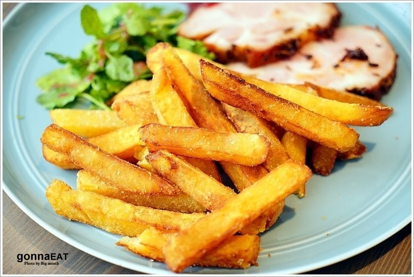 ▼一旁搭配的是讓人懷念的地瓜薯條,吃起來外酥內軟,還有自然的鬆軟香甜,單吃就很涮嘴,不管大人小孩都會喜歡的配菜!