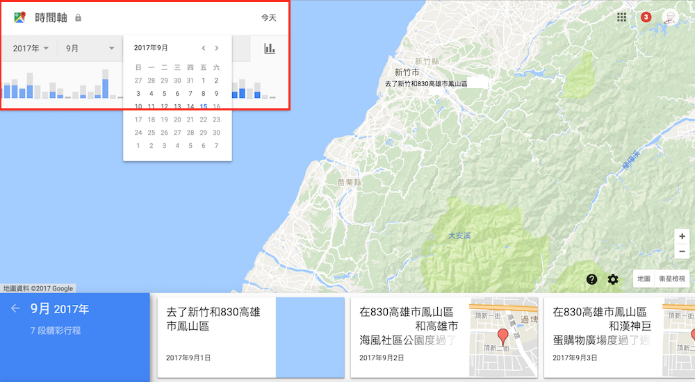 若要查詢某年、某月、某日的行程,可在控制區塊中選擇指定時間,這時 Google 地圖時間軸就會依照指定時間將行程整理出來,方便大家在選擇時間後就能馬上查閱。