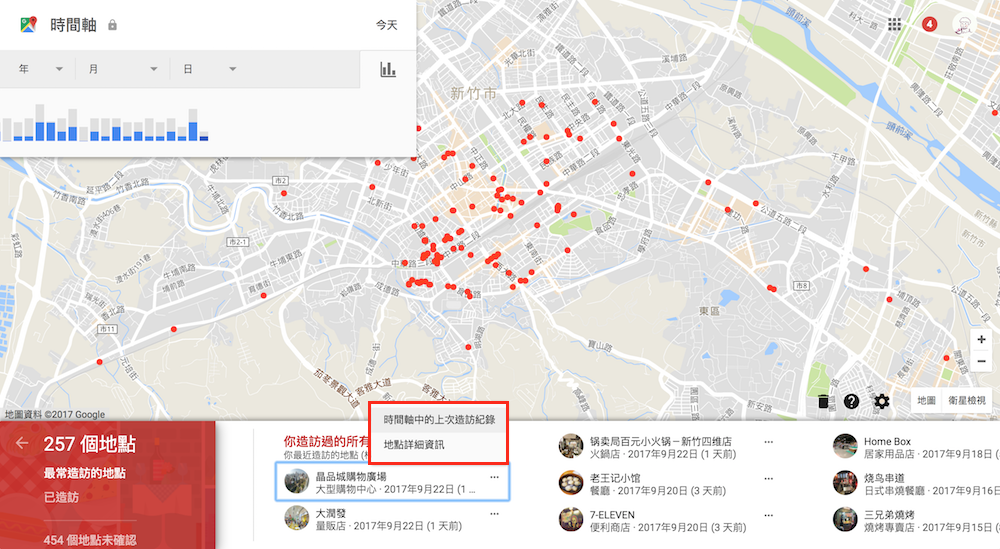 當我們透過 Google 地圖來開啟時間軸功能後,除了點選上方年/月/日的方式來查詢過去的旅遊資訊外,我們也可以透過點選下方「X 個地點」的方式,叫出過去曾去過的地點,以利查詢各種旅遊資訊。