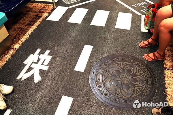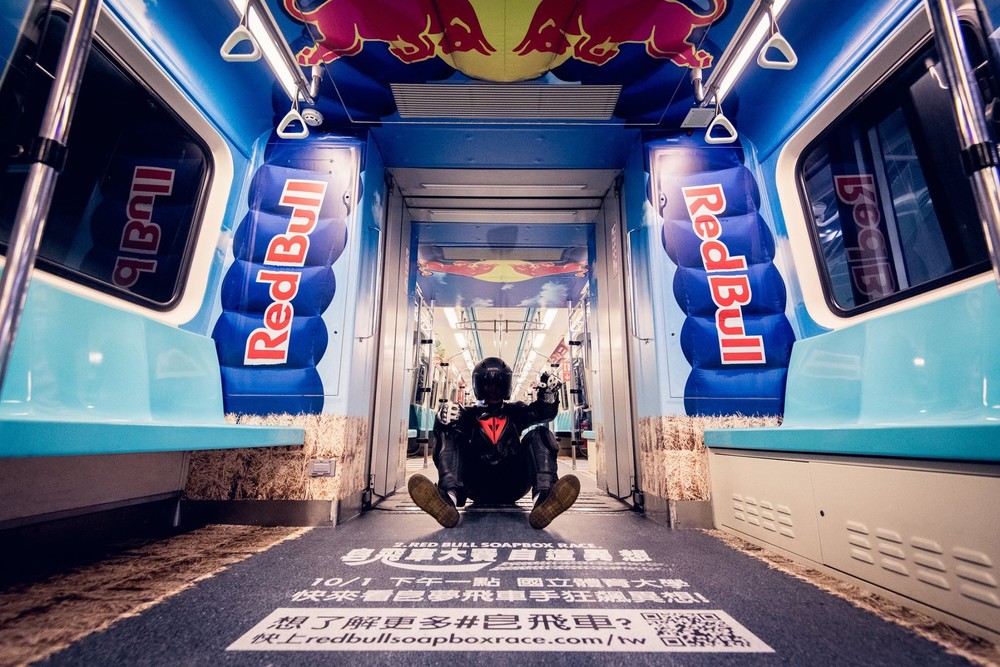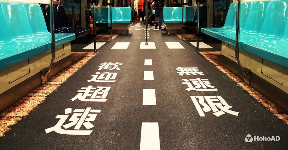 一上車就熱血沸騰!此次量身打造「皂飛車創意賽道」列車,將車廂地板變裝為柏油道路、稻草堆,擬真的斑馬線、雙黃線外,還加入令人驚嘆的小細節,香蕉皮、水溝蓋、車輪磨擦痕跡、五十圓硬幣等,宛如真實馬路情境,驚奇的3D視覺效果生動呈現捷運列車內!除此之外,大玩文字創意,車道上寫著「嚴禁無趣駕駛」、「禁止龜速」、「歡迎超速」、「無速限」等標語,把飛車手們的心聲都透過文字表露無遺!
