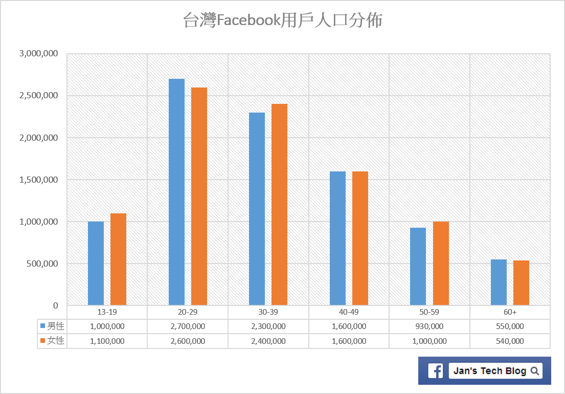 臺灣人黏臉書黏TT早在2013年已居全球之冠!據Facebook 2017年最近的臺灣用戶人口普查數據,以臺灣2,350萬人口估算,使用Facebook人口有1,800萬人之多,將近75%臺灣人在使用Facebook,觀察性別男女比例則以1:1非常接近;其中20-29歲的用戶最活躍 (530萬);其次是30-39歲 (480萬);正好發現市場消費主力集中落在20至39歲年齡層,剛出社會的新鮮人及工作穩定收入的族群,該族群人口含金量高,亦是較願意花錢享樂的族群。