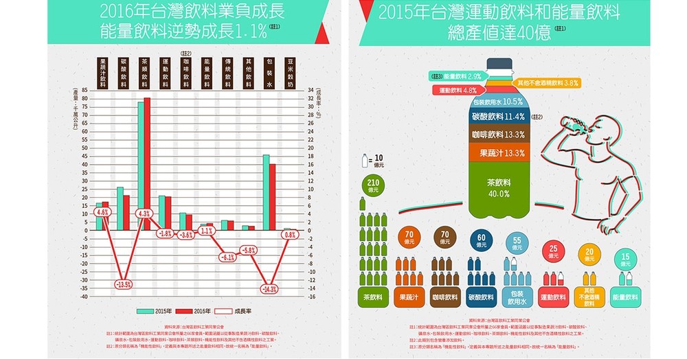 臺灣人工時長,當開車精神耗弱、工作疲勞轟炸,又得繼續撐下去時,大多數人選擇買杯咖啡或喝瓶能量飲料。觀看飲料工業同業公會資料,2016年至少賣出4,100萬公升能量飲料,能量飲料逆勢成長1.1%。《全球能量飲料十大趨勢動向》一文指出,能量飲料因具增強能量、消除疲勞、提神醒腦等特質,在全球飲料市場佔有一定地位,相關企業也積極地加強產品創新、行銷與溝通以扭轉產品印象。綜觀全球2012年1月到2017年6月間,在運動飲量和能量飲料類別中,全球新品數已累計高達6,893款,平均每年有1,253款新品上市。