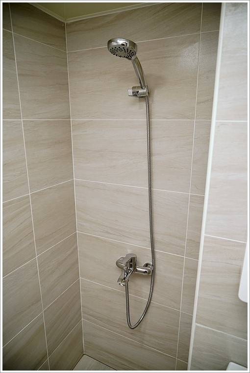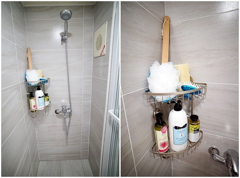▼浴室角架也相當重要,我個人偏好用鑽的固定比較牢固,一來我選用的這款壁磚是吸盤比較吸不起來的,二來就算用吸盤或黏貼式用久了都容易因為重量突然間掉下來,那時就會很傷腦筋要再重裝一次,所以一勞永逸的辦法就是用鑽牆固定,而且可以放很重的沐浴乳、洗髮精也不用擔心。