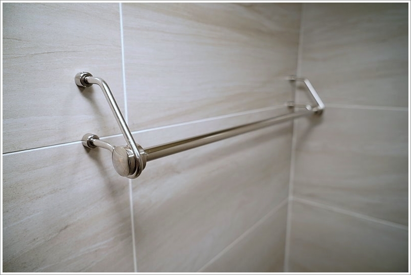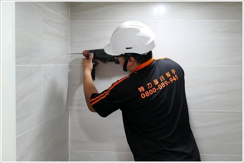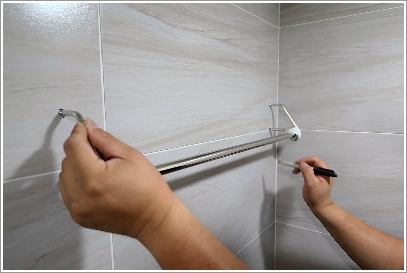 ▼工班與我確認好高度後,安裝上了我選的簡易型毛巾桿,雖然是簡單設計,但管理師還跟我分享經驗,選哪個牌子比較耐用等等,畢竟他們的管理師每天都要幫人量測與選配商品,這方面經驗很多,所以多一個專業的人可以問也超棒的!