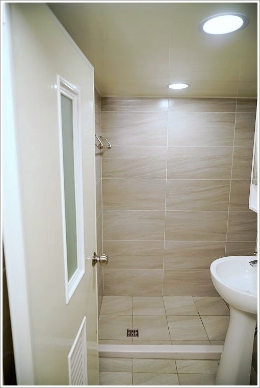 ▼再來提到是兩盞水電安裝上去的新式超薄崁燈,原來的衛浴只有一盞黃燈,室內昏暗,現在突然又白又亮,連我們家2歲的小可愛都發現浴室不一樣了啊! (選用薄崁燈有兩個好處,一來夠亮,二來他很薄,所以天花板不用像舊型崁燈需要很大的空間,壓縮了室內高度,當然也不用舊式那種外凸的傳統衛浴燈具,空間大釋放了! )