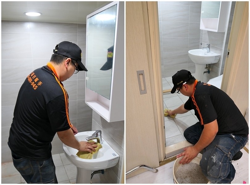 ▼由於最後的淋浴拉門施工不會有任何粉塵,所以進行到這裡,特力屋的工班師傅們就會開始清潔收尾了! 首先他們會從衛浴的地磚、壁磚開始擦拭,由於壁磚在填縫劑處理時也會留下粉塵,這些他們都會擦乾淨喔!