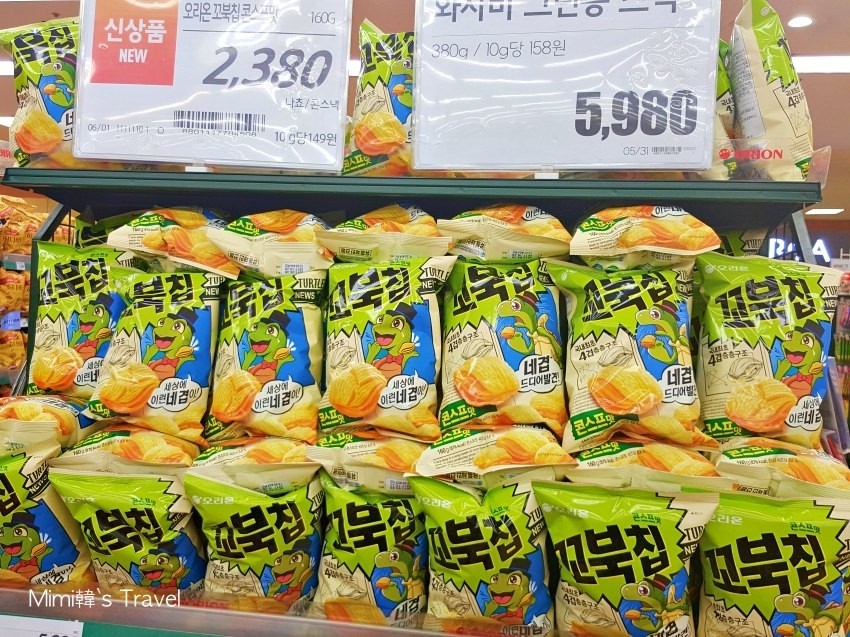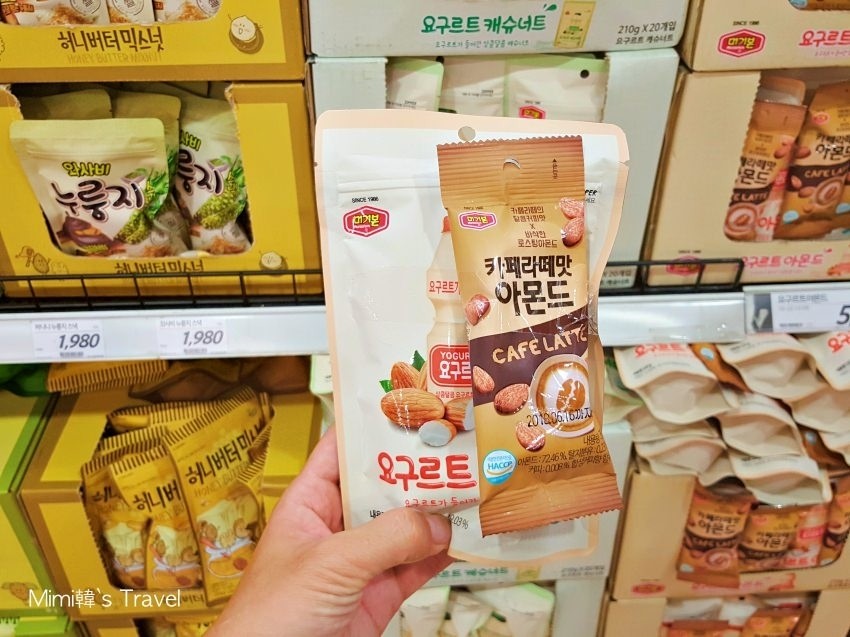 韓國必買的零食中,Honey Butter系列堅果一直是很多人推薦的必掃的目標,Mimi自己最喜歡的是黃色包裝的蜂蜜奶油,另外還有哇沙比、大蒜等口味。也提醒大家,它還有分成杏仁果、腰果,綜合堅果等包裝,買的時候記得注意看一下包裝上的圖案。