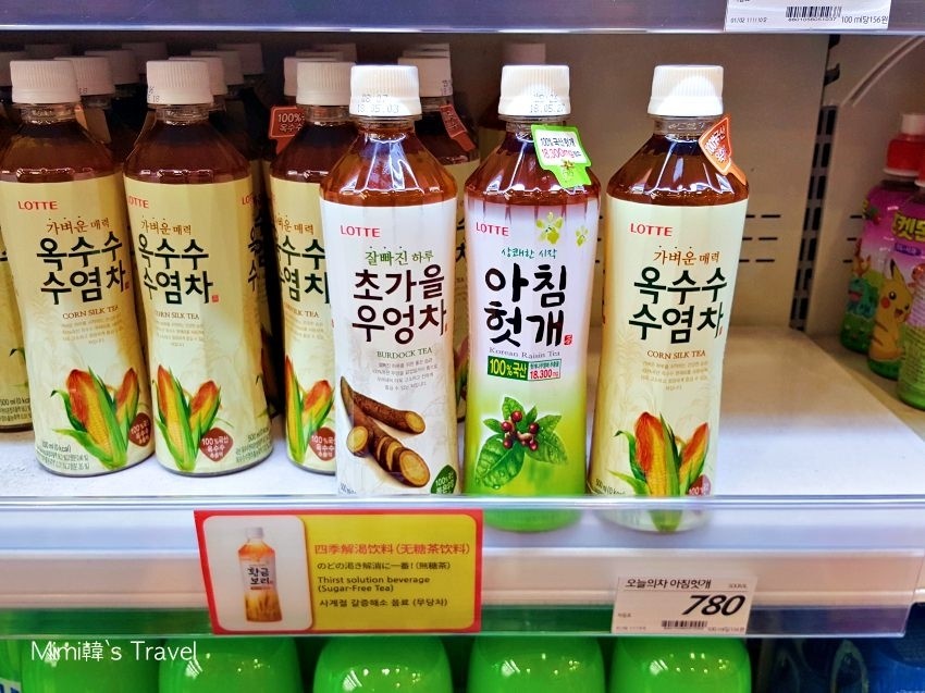 我們在台灣如果吃完口味較重的美食,都會習慣買杯手搖的無糖青茶或綠茶來解膩,但在韓國卻不太容易找到,後來發現這種無糖的玉米鬚茶、牛蒡茶還滿好喝,搭配像是泡菜鍋、烤肉炸雞也都滿對味,幾天下來也喝掉很多瓶。