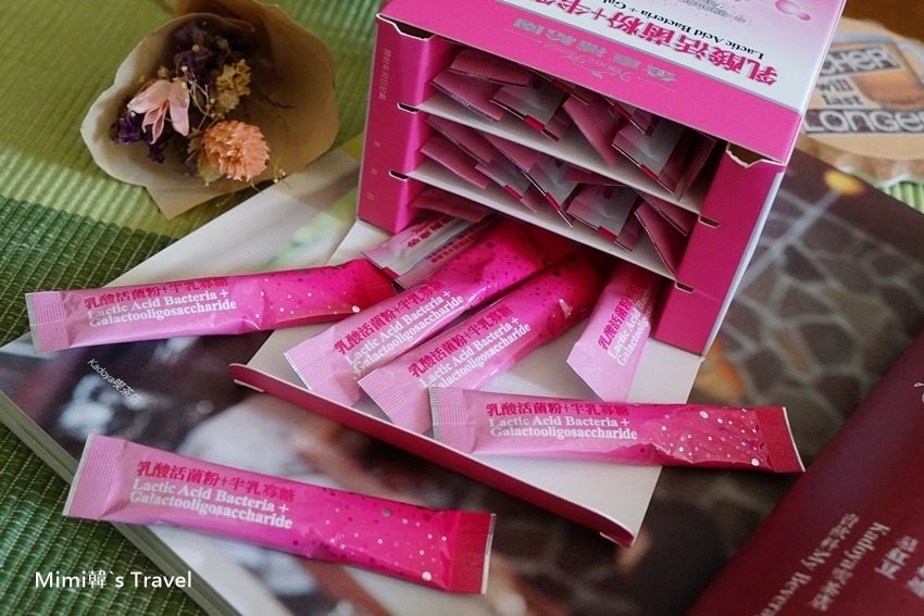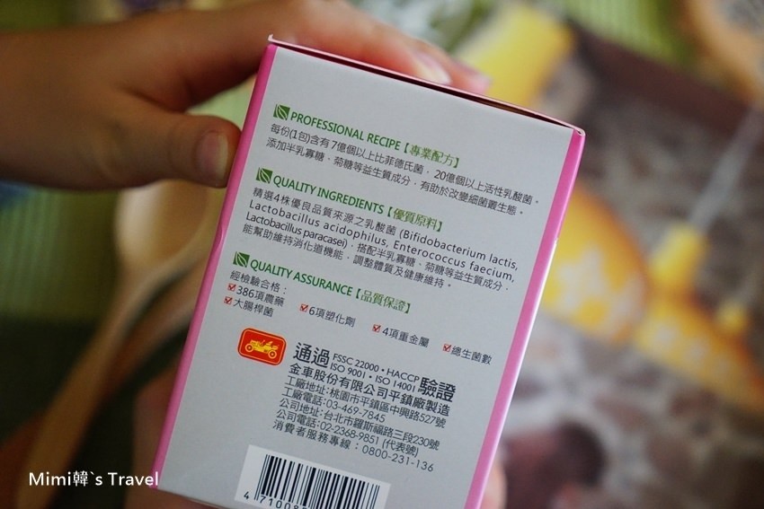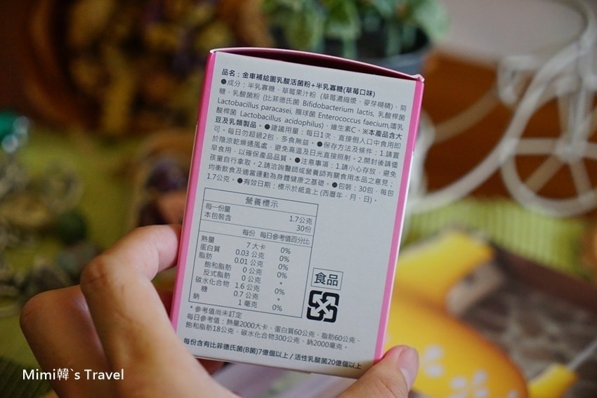 包裝外盒都有清楚標示,裡面共有比菲德氏菌、嗜乳酸桿菌、腸球菌、乳酸桿菌等4大優質菌種,另外含有半乳寡糖、菊糖等有益成分,最後為了讓口感更好,則是添加了草莓果汁粉。