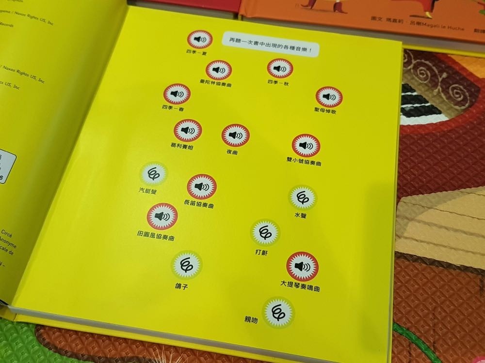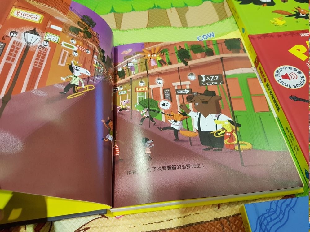 例如在古典樂的部分帕可會從第一頁開始用故事的方式每一頁每一頁的介紹一種樂器,還搭配最底頁的按鈕來讓小朋友可以按下去後聽到那樂器為主的音樂播放。