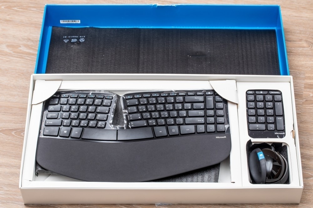 首先,這就是據說很符合熊體(其實是人體)工學的微軟Sculpt人體工學鍵盤滑鼠組,顧名思義裡面包括得一共有三部分,就是造型很獨特的鍵盤,還有分離設計的獨立式數字鍵台,再加上人體工學滑鼠