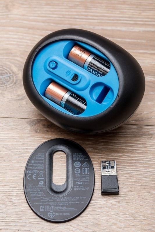 首先,這就是人體工學滑鼠,它是以磁性背蓋固定所以非常容易打開,裡面是使用三號電池,而USB頭也包含在內,只要插進電腦裡面即可連線使用
