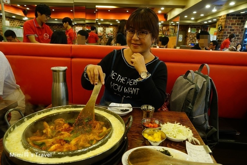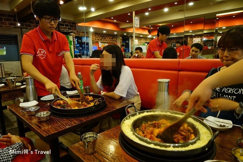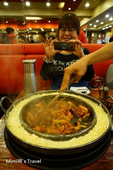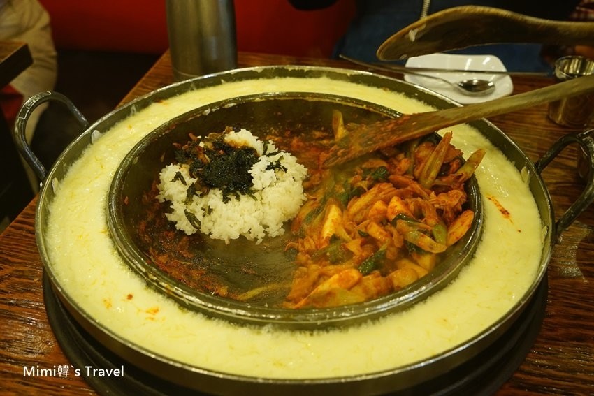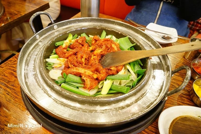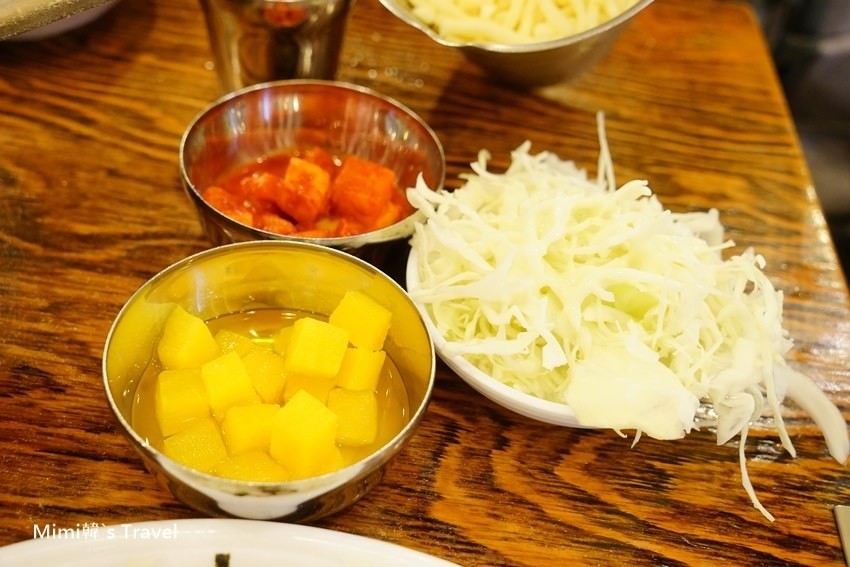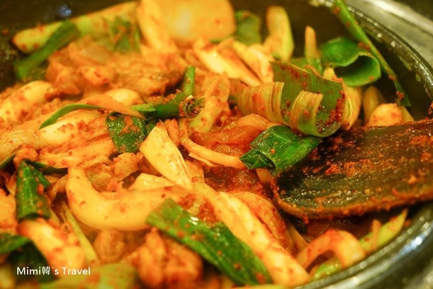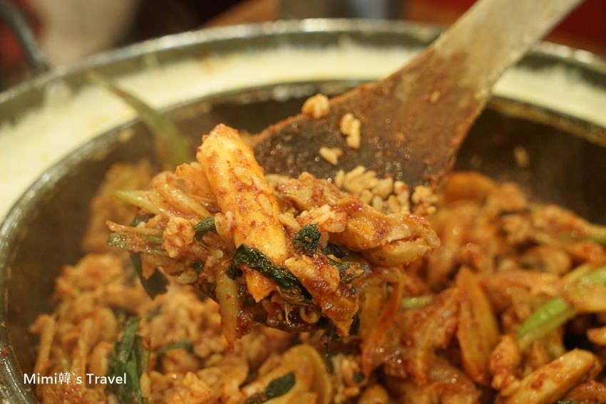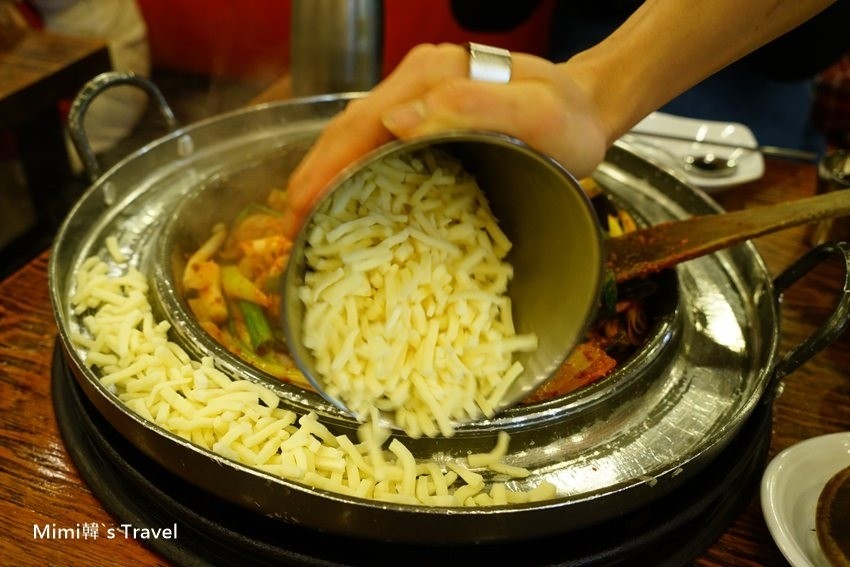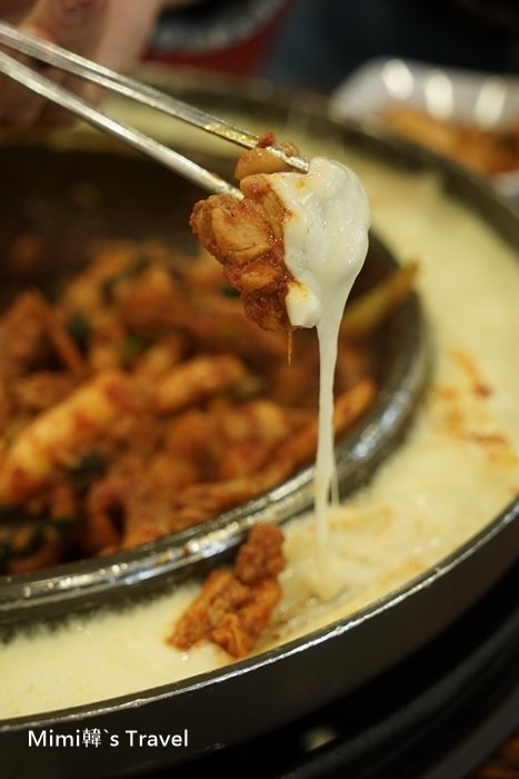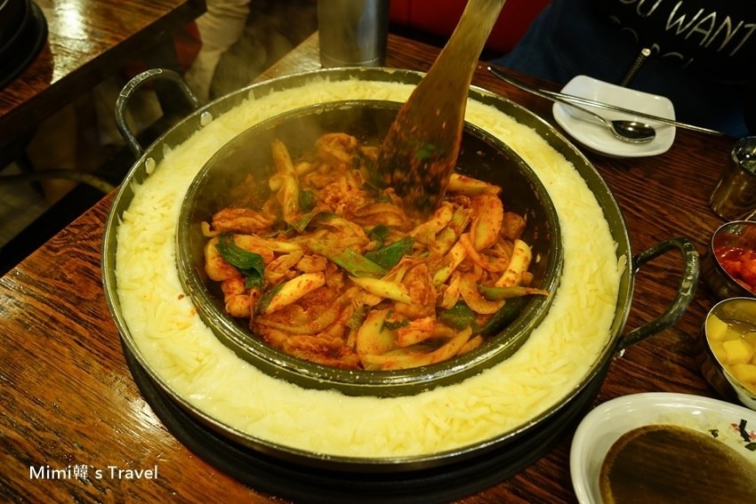 我們點了一份新鮮起司雞排(23,000韓元),中間就是辣炒雞,鍋邊則會鋪滿香濃的邪惡起司,整個過程都有桌邊服務,工作人員會一直幫妳炒到可以吃,不過他們不是一個人服務到底,就是炒一炒等加熱的時候她跑去忙別桌,過一陣子又會有另一位來接手繼續處理,看他們這樣忙來忙去也是挺有趣的。