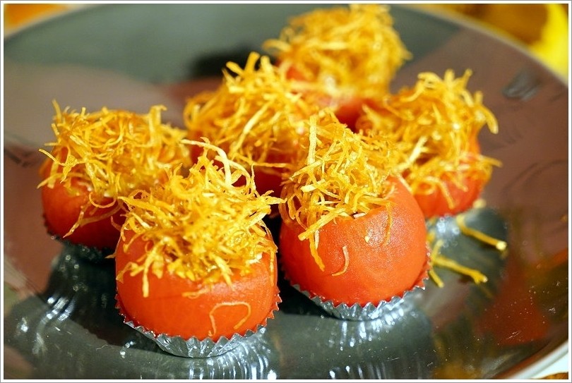 ▼番茄爆炸頭(320元),特別採用彰化溪州的「番茄方舟」溫室果園的天使串番茄,不僅去皮處理,上頭再搭配酥炸過的菇絲、軟嫩菇片,看起來造型獨特又討喜!一口吃下,不僅能吃到香甜多汁的番茄,搭配酥脆的菇絲口感與軟嫩滑順的菇片,口感多元又極富層次,香氣十足又帶有甜美多汁口感,甚至還有種爆漿的快感,搭配吃起來意外的好吃!