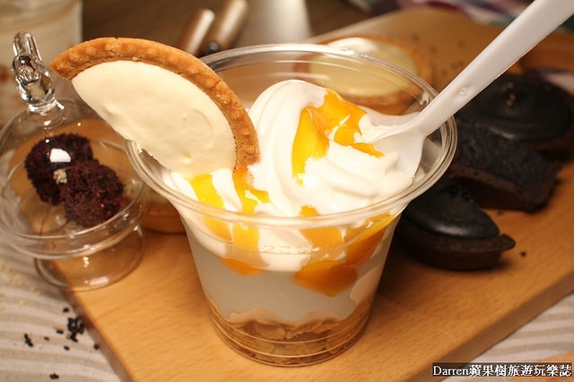 最上面放上半顆用法國起士、鮮奶油、酸奶製作而成的蕾雅起士塔,這杯可以說是充滿視覺與味覺的散步甜食