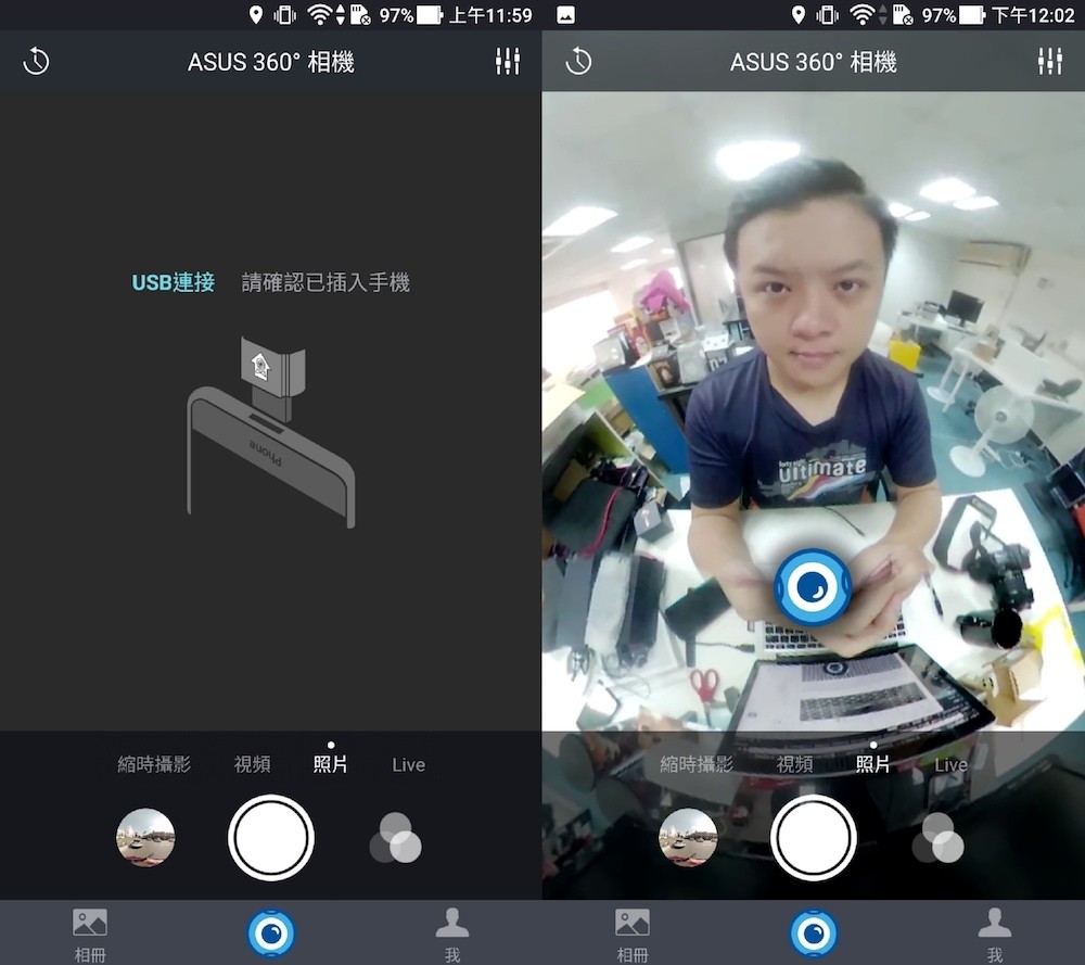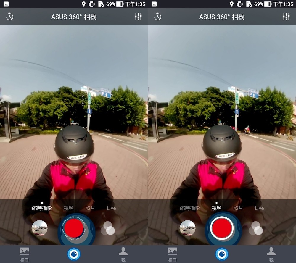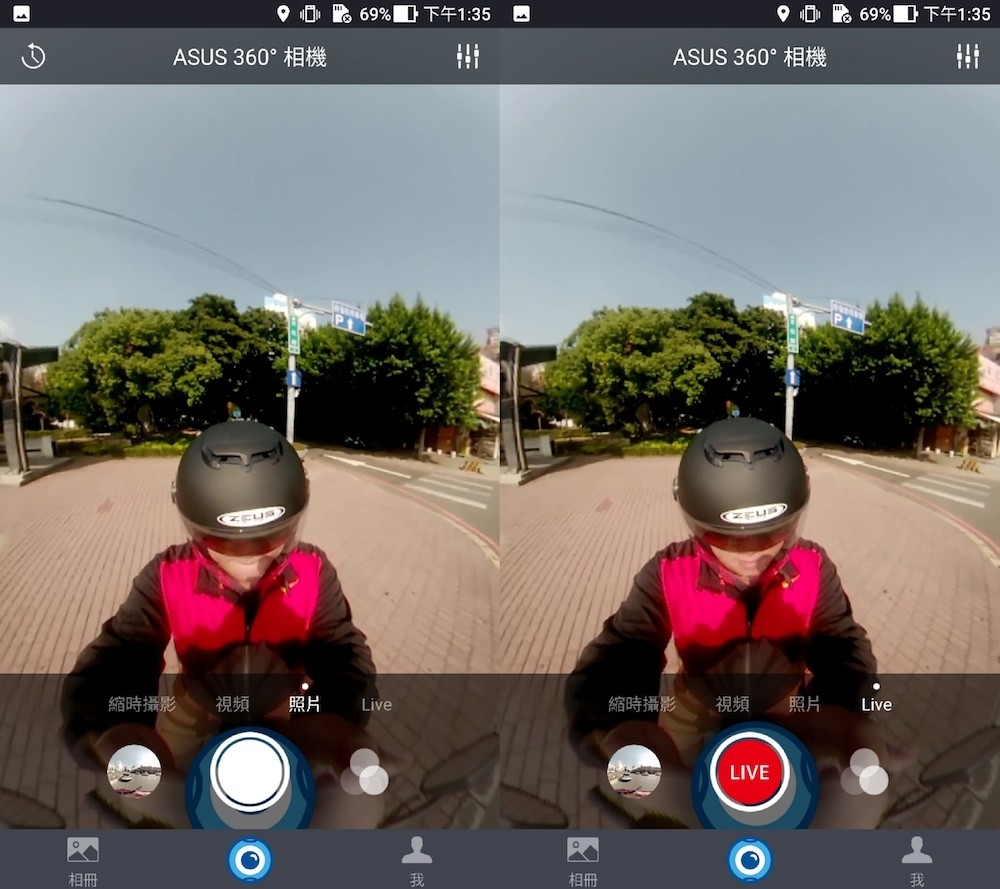 ASUS 360° Camera App 提供縮時攝影、影片錄製、照片拍攝以及 Live 直播四種拍攝模式,各個模式的切換方式非常簡單,只要在拍攝介面中點擊所需模式,App 就會快速切換到指定模式中。此外,為了讓用戶可以一眼辨識出目前使用的拍攝模式,每個模式都有對應的快門圖示,拍攝前可以多加留意。