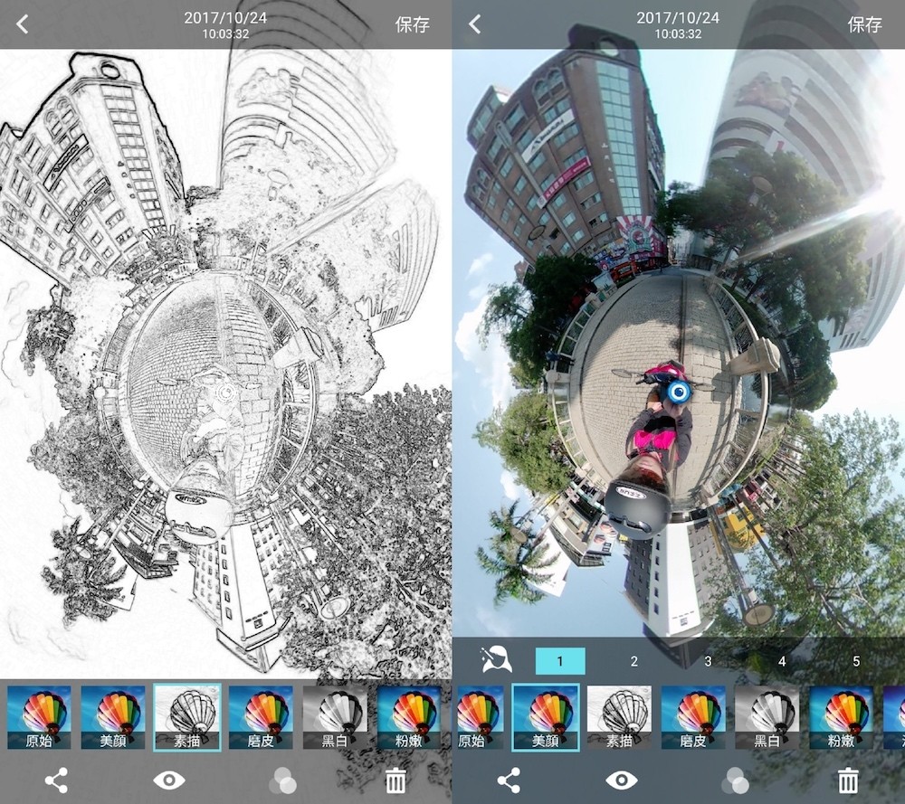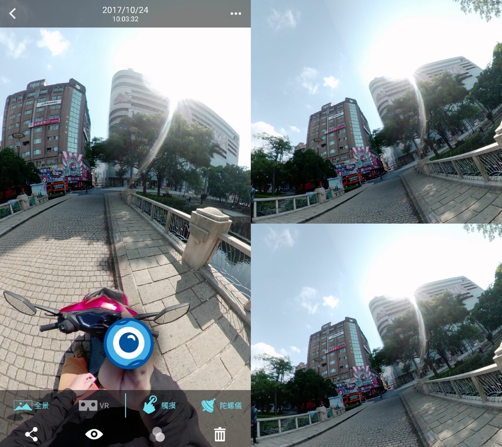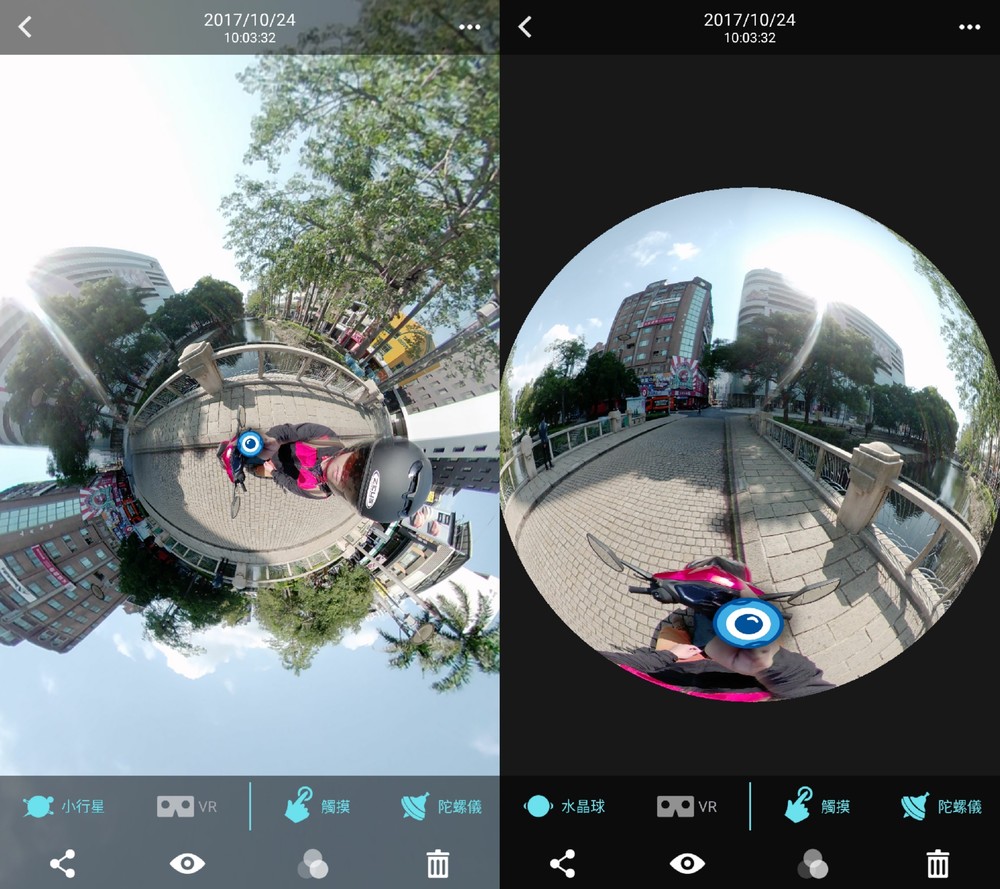 ASUS 360° Camera App 另有提供四種不同的視覺效果,除了預設的全景模式之外,還有可搭配 ZenFone AR 一起觀看的 VR 模式,以及小行星、水晶球模式,搭配可藉由觸控或陀螺儀調整拍攝角度的功能,要拍出有趣的 360 度全景照片也就更加容易。
