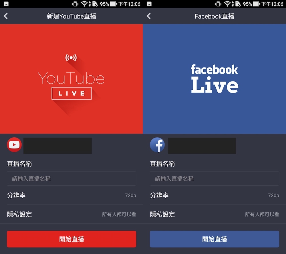 在 Live 模式中,目前提供 YouTube 與 Facebook 兩個社群平台,不過,Facebook 現階段尚未開放粉絲團直播,如果需要直播的話必須使用個人帳號才行,至於 YouTube 的部分,則是可以自由選擇要在任一已登入的帳號上進行直播。此外,雖然兩個直播平台皆支援 720p 輸出畫質,但 Facebook 卻限制觀眾最高只能觀看 480p 的畫質 (Facebook 直播限制,與此軟體無關),所以,要使用 Facebook 平台進行直播的用戶要特別留意。