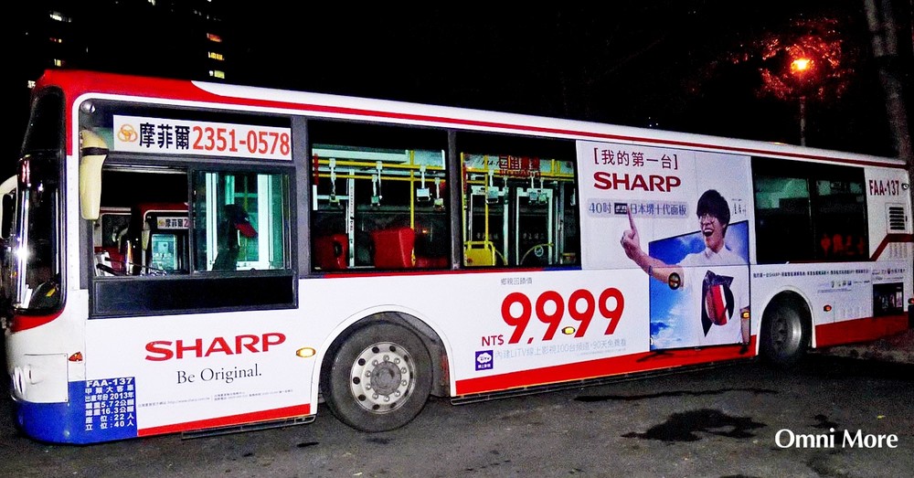 挑戰台灣電視市占率第一!台灣夏普與超商聯名,破天荒首推萬元有找 40 吋液晶電視,主打「我的第一台 SHARP 家電」,企圖拉近與年輕消費者之間的距離,打破過去SHARP家電售價偏高的印象。為有效吸引市場及目標族群注意,SHARP還找來「國民長孫」盧廣仲好感代言、打造「廣仲就在你身邊」捷運列車!甚至利用公車媒體,在台北街道佈下廣告訊息的天羅地網!根據統計,台灣的公車通勤族年齡大多落在20-49歲之間,SHARP一舉兩得,建立了親民形象,也更有效觸及年輕消費者的生活圈,一推出就供不應求的銷售佳績立即成真!