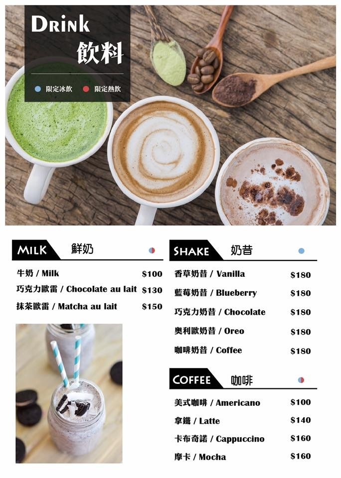 ▼冰水果茶(150元)、奧利歐奶昔(180元),想要清爽的果茶或是濃郁的奶昔通通有,而且口味都不錯,不會過於清淡!