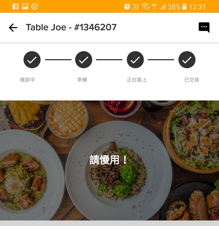 就在第 26 分鐘時,手機跳出了一個訊息說,目前餐點已經送出,大約 8 分鐘後抵達。