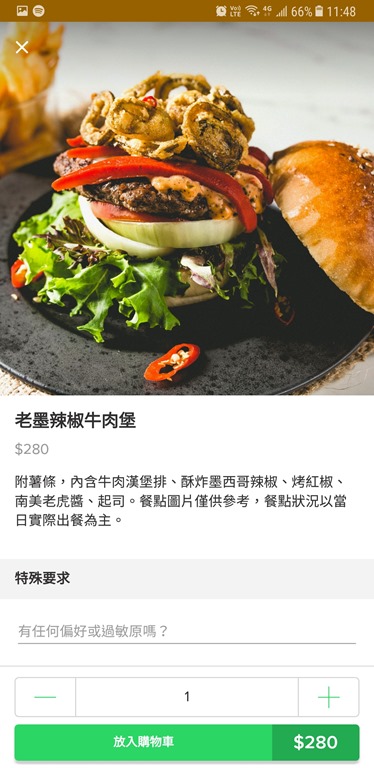 這次挑了比較熟悉的餐廳 喬桌子廚房來做測試,也點了之前吃過的 老墨辣椒牛肉堡 ,看看外送品質會不會掉。點餐時還有一欄附註可以填寫,例如有人不能吃花生類的食物,就可以在底下說明。