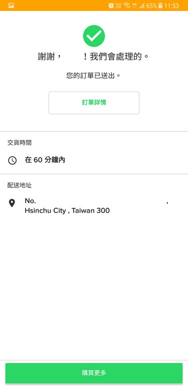好了,我們就來看看 60 分鐘內可不可以如期送達,送訂單時間是 11:53。