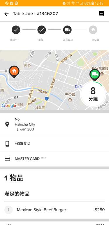 終於在 12:2X 時抵達,底下這張圖是我領了餐點後所截下來的,實際抵達時間大約是五分鐘前。